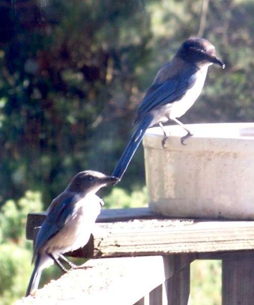 Two California scrub jays stop by the birdbath for a drink.