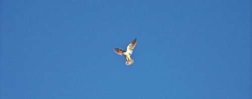 A White-Tailed Kitehovers over our field hunting for rodents. (They rarely eat birds.) Eighty years ago, the White-Tailed Kite was on the verge of extinction in California as a result of shooting and egg collecting, but White-Tails have now recovered to where their survival is no longer a concern to government ornithologists.