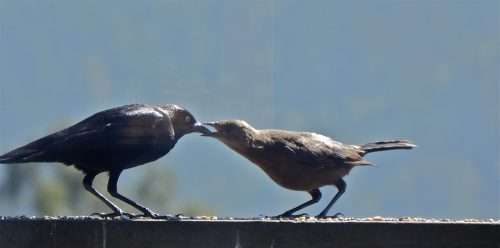 A Brewer’s Blackbird feeds seeds to its young. Along with seeds, Brewer’s Blackbirds eat insects, spiders, and berries.