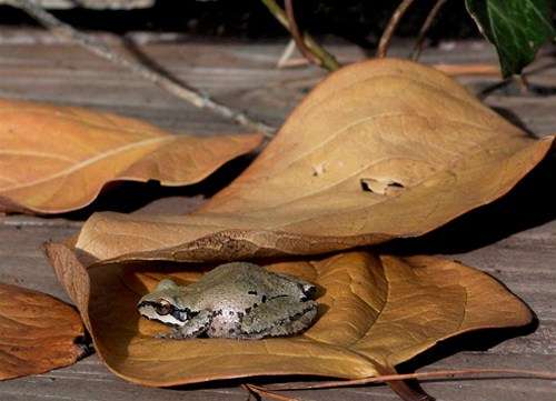 A Pacific Tree Frog chirps and then takes a rest on our deck.