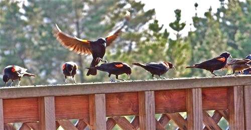 Redwing Blackbirds eating birdseed on the railing of our deck.