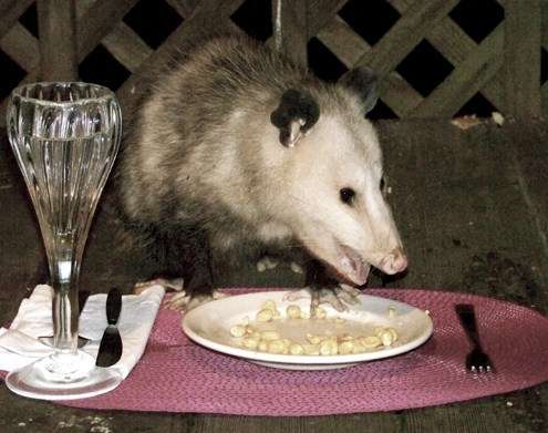 Fine dining. And since the same possum was becoming a regular dinner guest, I took time to teach him proper table manners, as has been noted here before.