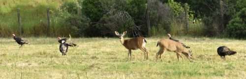 Different species cohabiting at Mitchell cabin. A flock of wild turkeys casually walks past a doe and young buck, which hardly notice.