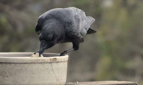 A raven moistens bread in our birdbath to make it easier to swallow. God only knows where he found the bread, but then he’s always coming up with biscuits, cookies, birds eggs, and animal parts. Last week Lynn and I watched this raven kill a gopher in the grass and then tear it apart.