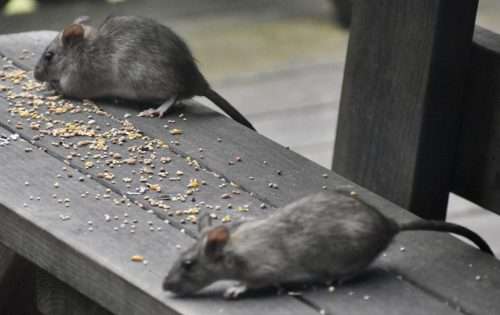 Two roof rats gobble up birdseed before the birds eat it all.