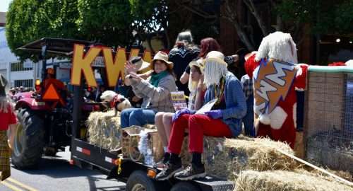 The parade entry of KWMR FM won first place in the adult-float category of the parade. Four baby goats owned by truck owner John Roche Services, which uses goats to trim grass, were in the cage at right. In the center clapping is my wife, Lynn, a member of the community-owned radio station’s board of directors.