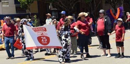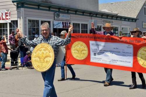 Bill Barrett leads the parade entry of the Coastal Marin Fund, which benefits local nonprofit organizations by selling artistic brass coins to use for local purchases and for tourists to take home.