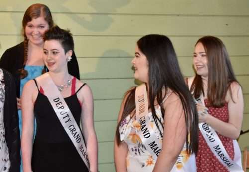 Competitors in the junior grand marshal ticket-selling competition were (from left): Coco McMorrow, Heidi Gonzalez, and Hana Cassel. Miss Gonzalez ended up junior grand marshal while Ms. McMorrow and Ms. Cassel were named deputy junior grand marshals. Last year’s junior grand marshal, Mollie Donaldson (in back), hung the sashes on the three.