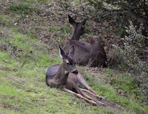 Doe and fawn graze, lie on grass,