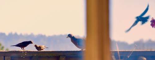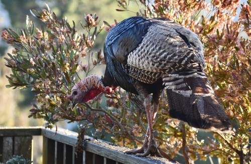 A female wild turkey landed on the railing of our deck Friday to partake of seeds we’d scattered there for other, smaller birds.
