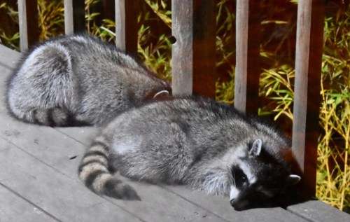 Two raccoons asleep on our front deck still later Tuesday evening. Mitchell cabin has obviously become a secure enough retreat that a variety of wildlife nap here.