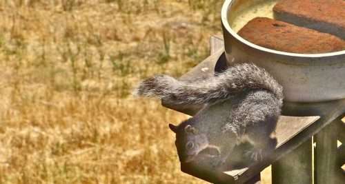 A roof rat and towhee have an ecumenical dinner of their own, quietly snacking on birdseed atop our picnic table.