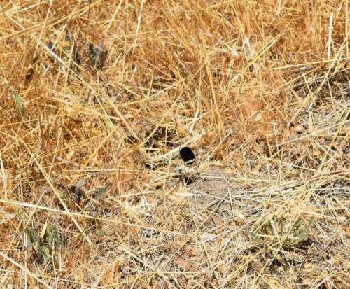 A bumblebee heads downhill to its swarm’s hole in the dirt. When we were getting the fields around Mitchell cabin mowed and weed whacked on June 10, as was reported here, the workers did a great job but had to leave one patch of grass untrimmed; when they went near it, they were met by a swarm of bumblebees. By being alert, I was able to sneak into the patch twice a few days later to finish the job. In the process, I finally located their well-hidden nest. I’d not seen one before.