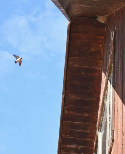 A cliff swallow sails up to a nest under our eves. Over the past month, swallows have built the nest two stories up over our kitchen.