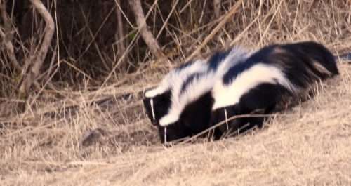 A stinky trio, three skunks march around the field above Mitchell cabin in tight formation.