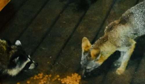 A raccoon and a gray fox got together for an ecumenical dinner outside our kitchen door Monday night. Raccoons can be aggressive when other raccoons try to horn in on their kibble snacks, but foxes and skunks get a free pass.