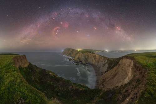 “Northern winter constellations and a long arc of the Milky Way are setting in this night skyscape looking toward the Pacific Ocean from Point Reyes on planet Earth’s California coast. Sirius, alpha star of Canis Major, is prominent below the starry arc toward the left. Orion’s yellowish Betelgeuse, Aldebaran in Taurus, and the blue tinted Pleiades star cluster also find themselves between Milky Way and northwestern horizon near the center of the scene. The nebulae visible in the series of exposures used to construct this panoramic view were captured in early March, but are just too faint to be seen with the unaided eye. On that northern night their expansive glow includes the reddish semi-circle of Barnard’s Loop in Orion and NGC 1499 above and right of the Pleiades, also known as the California Nebula.” — From NASA website, March 12. Photo by Dan Zafra.