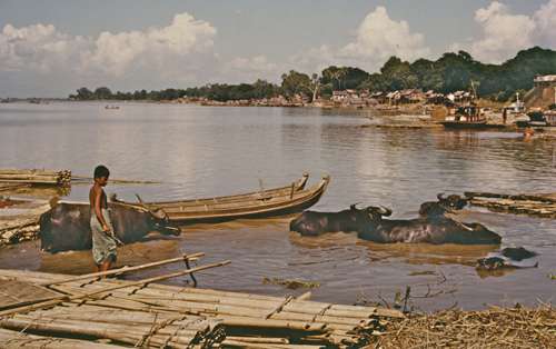 Boy tending water buffalo at the edge of the Irrawaddy River at Mandalay (1986).