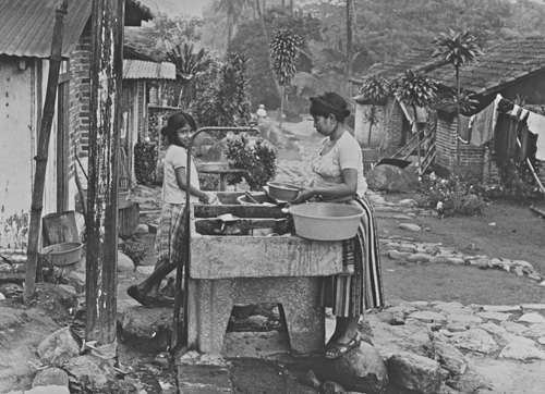 Two Mayan girls wash dishes at a pila (outdoor trough) because their homes on a finca (plantation) lack running water. For many women in rural villages, washing dishes and clothes together at a community pila is their primary time to socialize.