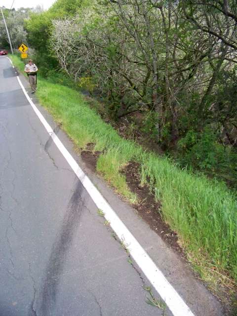 From skid marks on the pavement, it appears the driver lost control in rounding the first curve east of Point Reyes Station. He then over-corrected and ended up in the oncoming lane before spinning back across the road and off the embankment.
