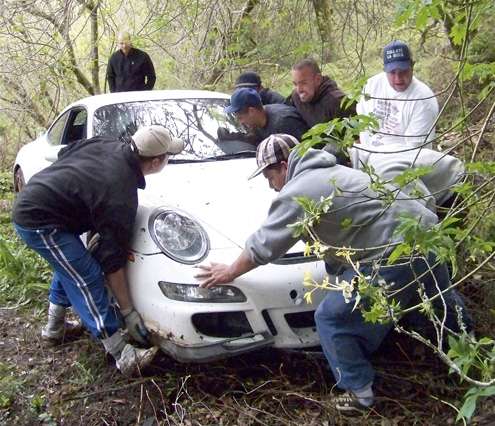The white Porsche GT-3, which landed facing back toward the road, was airborne for roughly 50 feet, as evidenced by bare spots where bark had been knocked off limbs high above the ground.