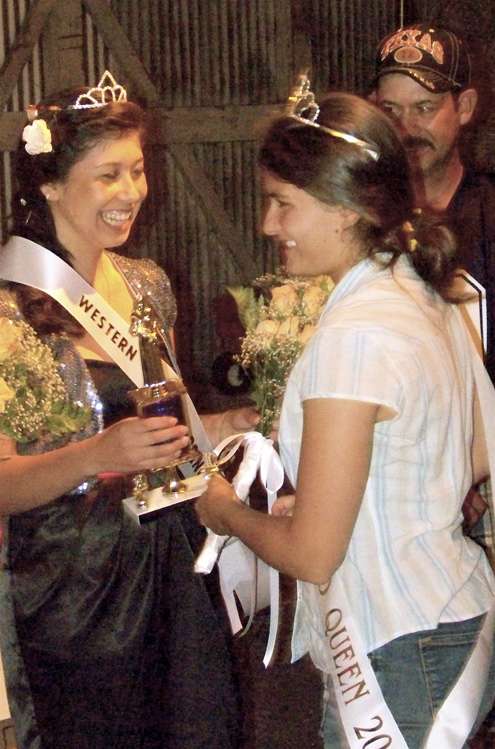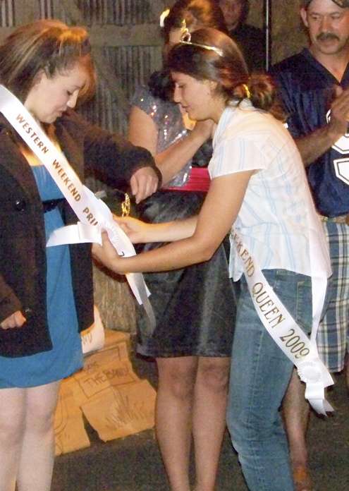 The queen’s coronation. During a break in the barn dance, last year’s Western Weekend Queen Mindy Borello adjusts the queen’s sash on 1010 Western Weekend Queen Ashley Arndt before presenting her with a trophy and crown. The contestant who sells the most Western Weekend raffle tickets is named queen.