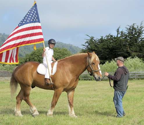 Horses and cows were on display at the Giacomini Ranch field across Sixth Street. Here Sawyer Johnson of Inverness rides an enormous horse named Major, which is being led by Sawyer’s father Chip Johnson. The 18-hand Belgian (six feet high at the withers, i.e. shoulders) was purchased from Walt Disney Studios. Photo by Linda Petersen, West Marin Citizen