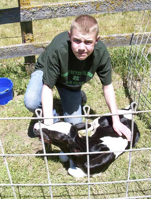 This two-day old Holstein from the Nunes Ranch on Point Reyes was a hit of the fair. Holding the calf, which has been named Buster, is Nathan Hemelt, who lives on the ranch.