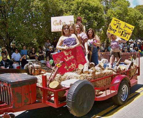 Dancers having fun on an entry advertising Very Nice Firewood of Point Reyes Station.