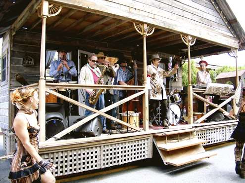 Grand Prize-winning float. El Radio Fantastique performs while rolling down the main street in a cabin on wheels.