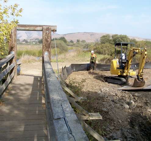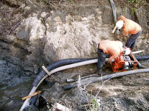 While the project is underway, a series of cofferdams keeps ditch water out of the worksite. Water in the dams is being pumped into Olema Marsh.