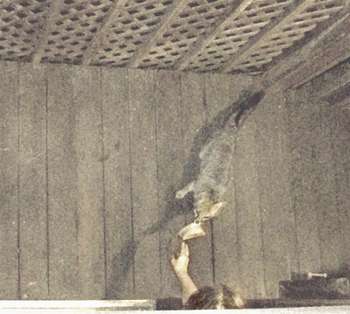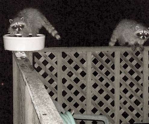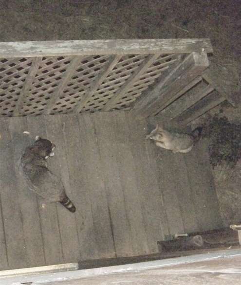 This is not to say that no other wildlife alarms raccoons. One kit sprang onto a post of the deck railing tonight and was about to climb to the top when suddenly it froze and flattened itself against the lattice.