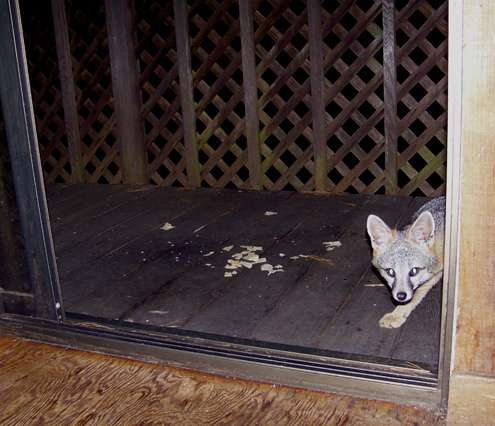 The foxes, however, seem not to be alarmed by any creature around my cabin. Sunday night when I scattered some tortilla chips on the deck and left the door open, this fox was curious enough about my kitchen to look inside before chowing down on the chips.