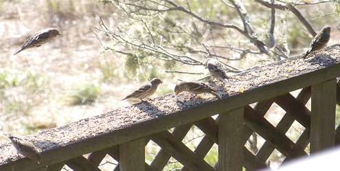 A pine siskin swoops down to join five other siskins eating birdseed on the railing of my deck.
