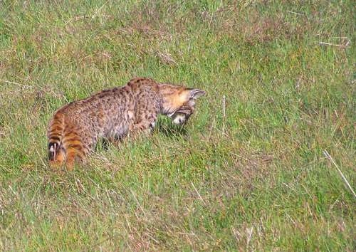 A blacktail buck and a bobcat foraging near each other on the hillside above Mitchell cabin. Each was aware of the other but didn’t seem to care.