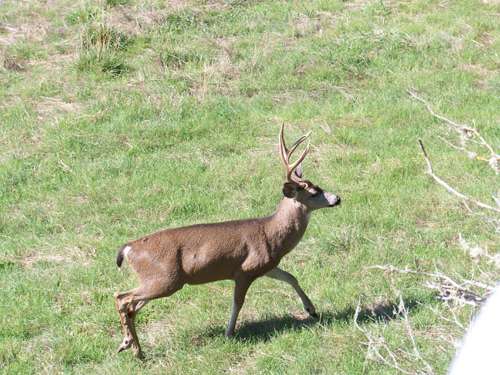 A blacktail buck takes a rest next to the front steps a short distance from the deck. Although two of us took turns photographing him, he must have felt safe, for he stuck around.