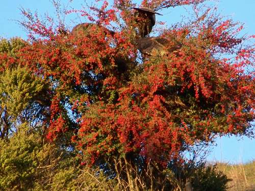 Before long the source of the disturbance became obvious when a flock of wild turkeys fluttered to the ground. What had they been doing up in the bush? I was surprised that the bush’s bitter berries are safe to eat, so I checked the Seasonal Cooking website. “Contrary to a common myth, they are not poisonous,” the site said. “Pyracantha, a relative of apples and roses, is entirely edible.” In fact, you can use the berries to make preserves and jelly.