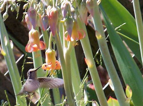 A female hummingbird. Hummingbirds drop by for drinks whenever we have flowers in bloom.