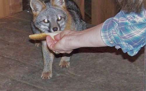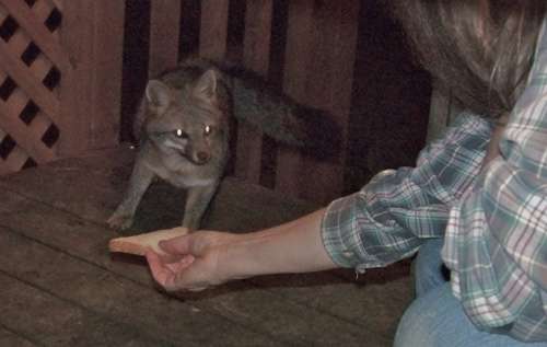 After sizing up the situation Saturday night, a gray fox takes a slice of bread from my girlfriend Lynn’s hand.