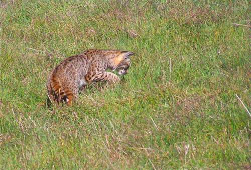 Last week I posted a couple of photos of a bobcat that had just shown up outside my kitchen window. Here’s a third image that shows it hunting. Bobcats’ favorite prey are rabbits and hares, but they’ll eat anything from insects to rodents to deer.