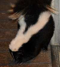A skunkor two also show up on our deck virtually evening to eat any kibble the raccoons leave behind. This one showed up Wednesday. They raise their tails when disturbed but never spray, at least while on the deck.