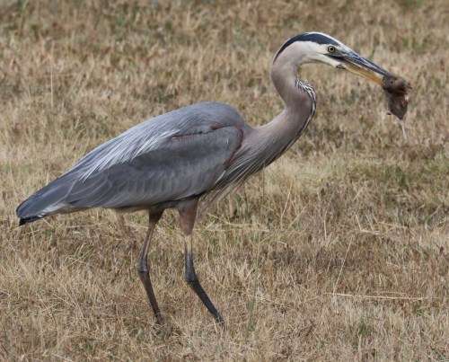 Got him. Two weeks ago this blog published photos of a young great blue heron hunting gophers near our cabin, and a few days later neighbor Dan Huntsman snapped this great shot of the heron holding a gopher it had just caught.