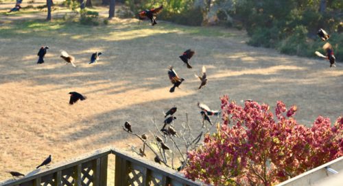 Redwing blackbirds waiting for a dinner of birdseed at Mitchell cabin maintain proper social distancing (relative to size).