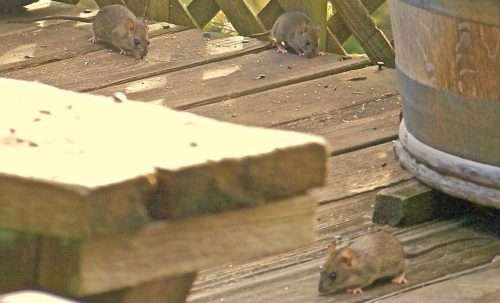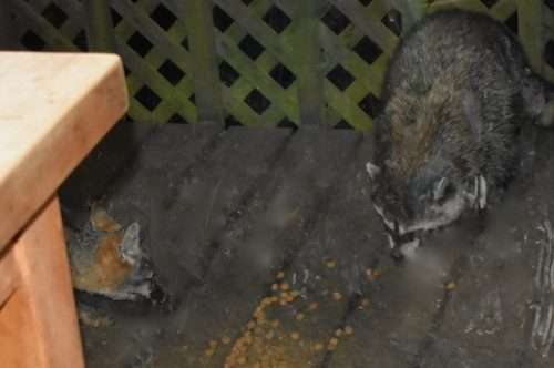 A roof rat and towhee have an ecumenical dinner of their own, quietly snacking on birdseed atop our picnic table.