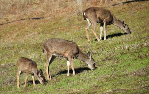 The green shoots attract blacktail deer, and as many as eight at a time have begun showing up for the feast. For dessert, they often dine on persimmons that have fallen from our tree on the other side of the cabin.