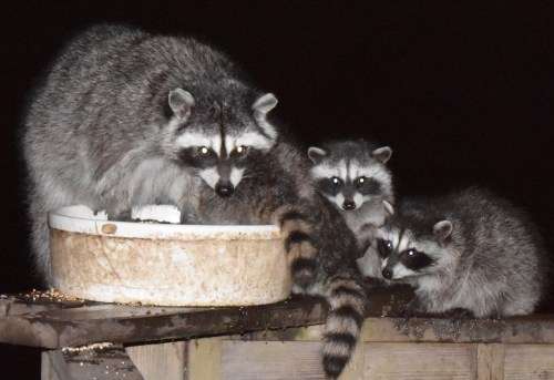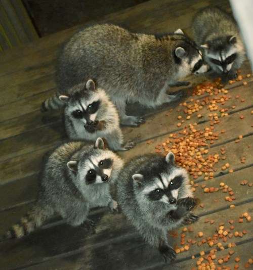 A mother raccoon with her four kits show up outside our window every evening hoping to be fed, and we usually give them a few handfuls of dog kibble.