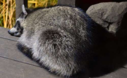 Snoozing raccoon. Early Tuesday evening I was surprised to find this raccoon sleeping on our deck quite close to our front door.