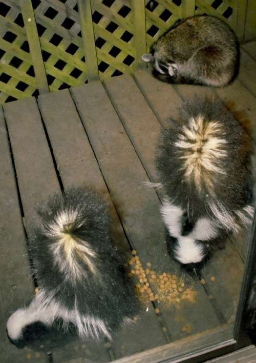Sleeping place invaded. A short while later, another raccoon began snoozing a few feet from our kitchen door only to have two skunks show up to finish off the handfuls of kibble I’d given the raccoon. It appeared to pay only drowsy attention to the skunks and stayed put.