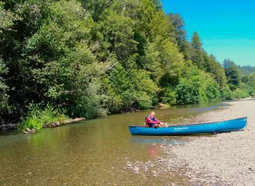 The Gualala River is a large part of what keeps bringing us back. (Lynn took this photo of me during a 2012 trip.) Adventure Rents, which operates from a clearing on the bank just downstream from the Gualala Bridge, offers kayaks as well as canoes; we always rent a canoe. The river’s current is fairly weak at this time of year, making it easy to spend an afternoon paddling upstream. Because of wind off the ocean, paddling downstream into the lagoon and back would have been far more laborious.