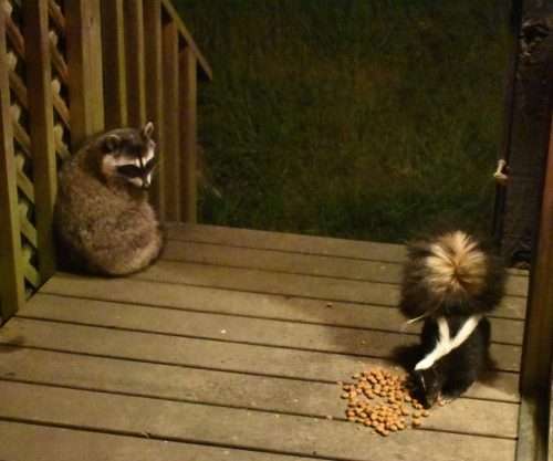 A raccoon with four small kits now show up on our deck every evening, and we usually give them handfuls of dog kibble. Unfortunately, a skunk recently figured out the routine and has begun arriving around the time the raccoons are done eating. Neither animal alarms the other. This mother raccoon sometimes takes a nap while the skunk eats. On other nights, they eat side by side. It’s really too bad that humans don’t have the gentility of raccoons and skunks.